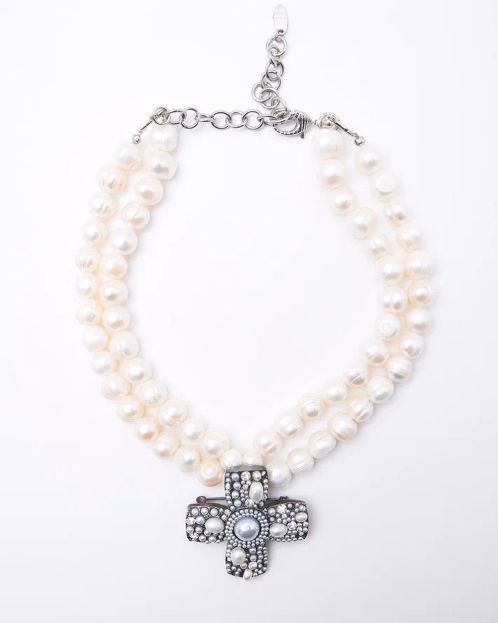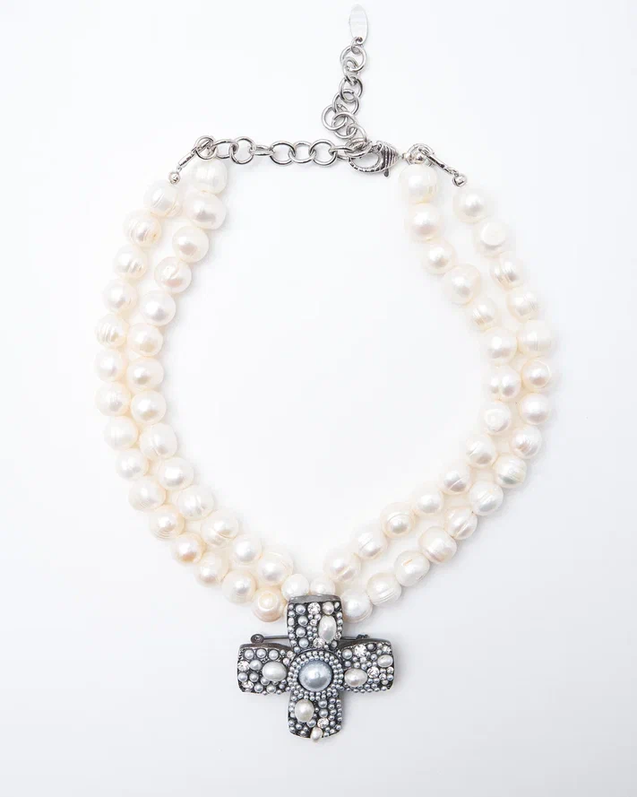 Ювелирный сплав, покрытие родий, натуральный жемчуг с брошью кулоном в виде креста
