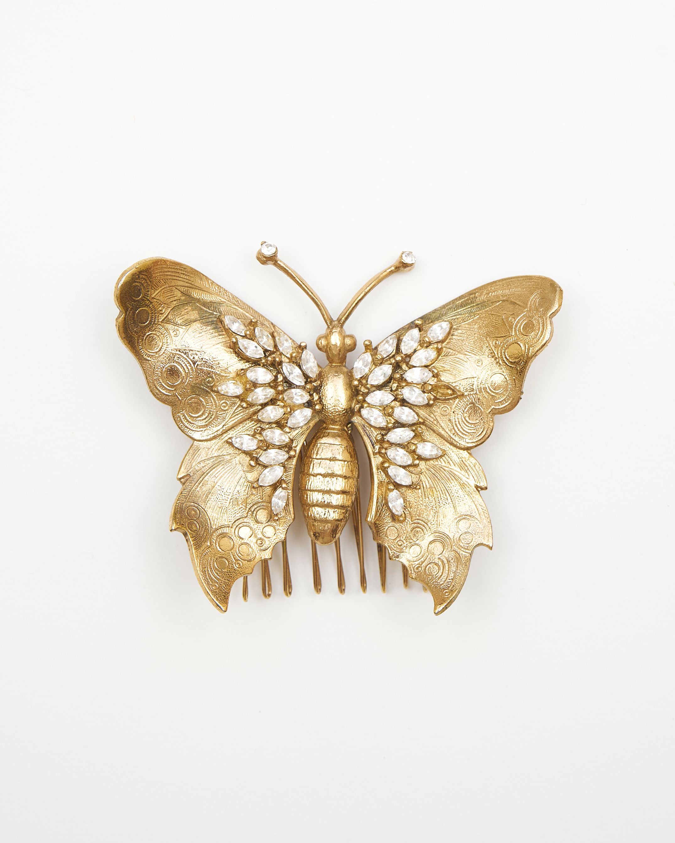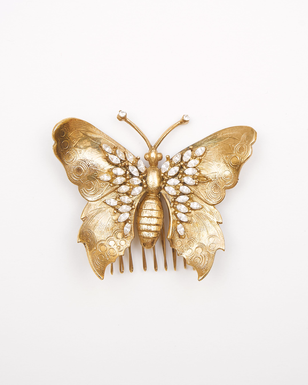 Гребень-бабочка ручной работы из латуни с покрытием из 24-каратного золота и кристаллами Swarovski.